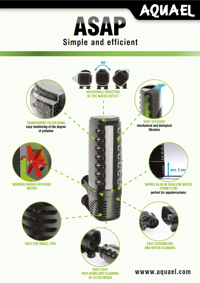 Les nouveaux filtres internes ASAP conviennent également parfaitement aux aquaterrariums, car ils peuvent fonctionner dans des eaux peu profondes à une profondeur de seulement 5 centimètres. En outre, ils oxygènent efficacement l’eau dans le réservoir en provoquant un fort mouvement de la surface de l’eau. Grâce à leurs propriétés fonctionnelles, ces filtres peuvent être utilisés par les aquariophiles débutants et expérimentés.