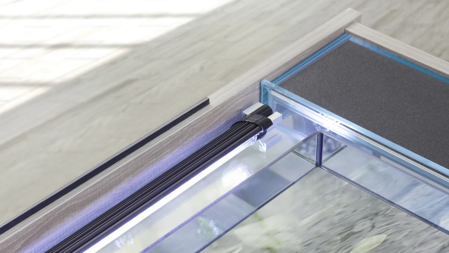 L’aquarium AquaTable est équipé de 2 rampes spéciales Eau Douce EasyLED 2.0 de 28W chacune. Ces dernières sont maintenant dotées de deux canaux de lumière indépendants, ce qui constitue une excellente amélioration qui augmente la qualité de l’équipement. La technologie LED garantit une haute qualité de la lumière émise grâce à sa puissance élevée. Avec structure en aluminium. En option, il est possible d’utiliser le contrôleur AQUATLANTIS Luminus qui permet de contrôler tous les paramètres indépendamment et selon les désirs de l’utilisateur. Il a deux canaux indépendants avec quatre intervalles de lumière, permettant de créer la lumière du jour avec effet du lever et du coucher du soleil, allumant et éteignant les lampes progressivement.