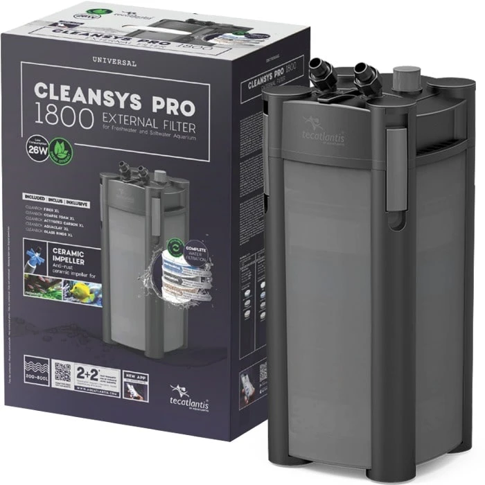 AQUATLANTIS CleanSys 1800 PRO est un filtre externe puissant et efficace pour aquarium d’eau douce et d’eau de mer de 200 à 800 L de volume. Ce filtre extérieur a trois atouts majeurs : sa faible consommation d’énergie (26W seulement), son système de masses filtrantes innovant et son rotor en céramique anticorrosion pour un fonctionnement ultra silencieux et durable.