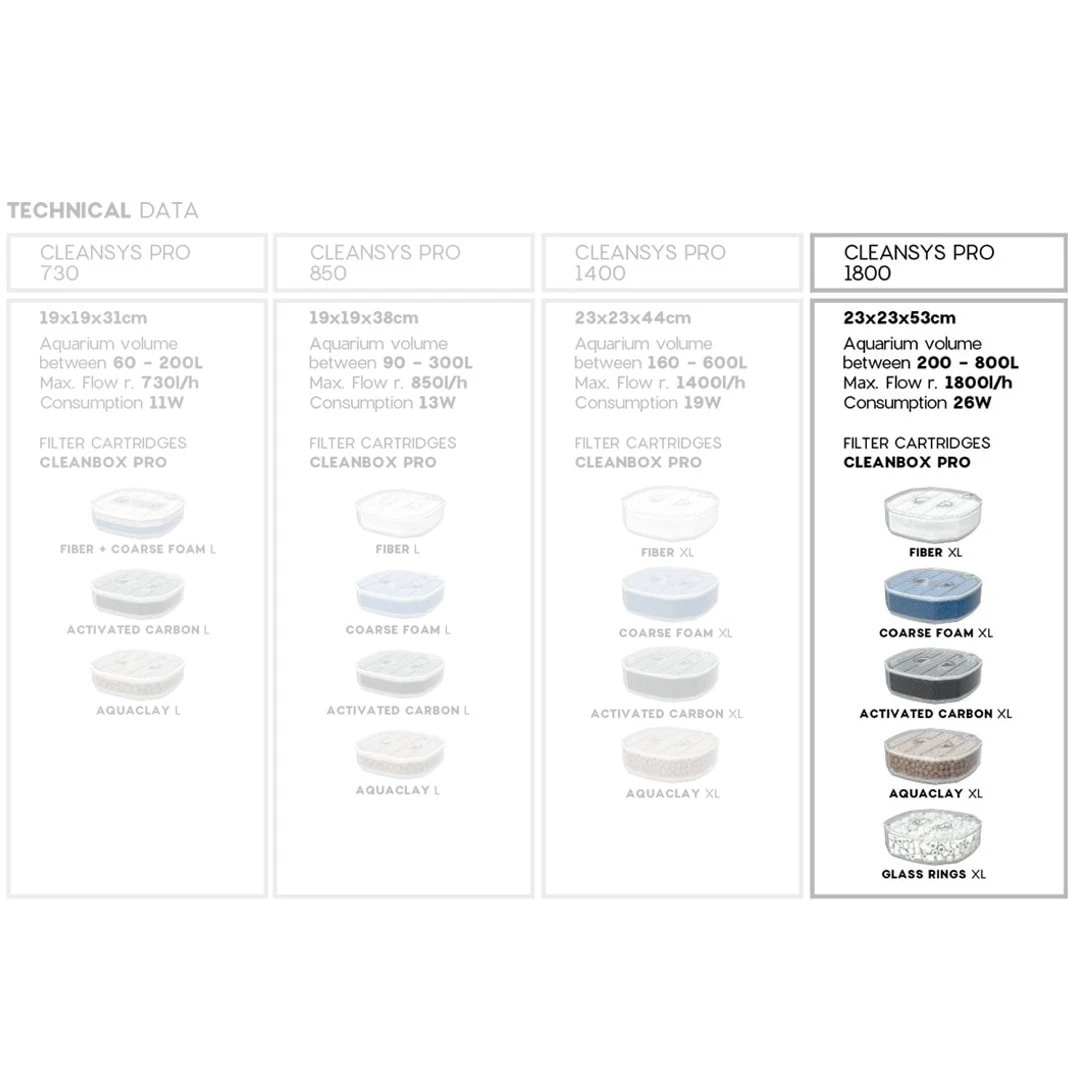 Le modèle de filtre 1800 PRO, est livré avec 5 cartouches de filtrations CleanBox Pro XL, qui effectuent une filtration complète de l’aquarium :