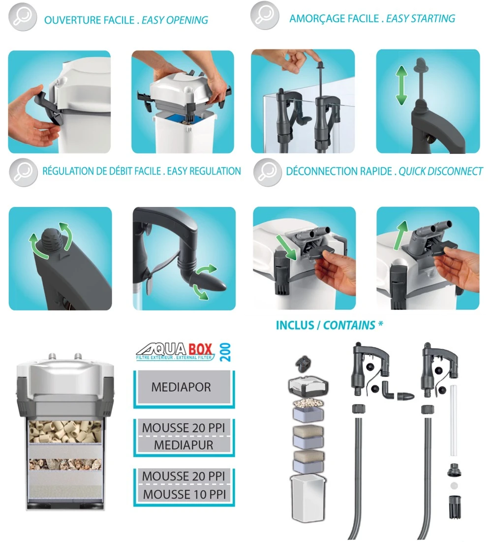 Le nouveau filtre externe AQUAVIE AquaBox 200 d’un débit de 700 L/h est idéal pour un aquarium de 100 à 200 L. Il est livré complet et prêt à l’emploi.