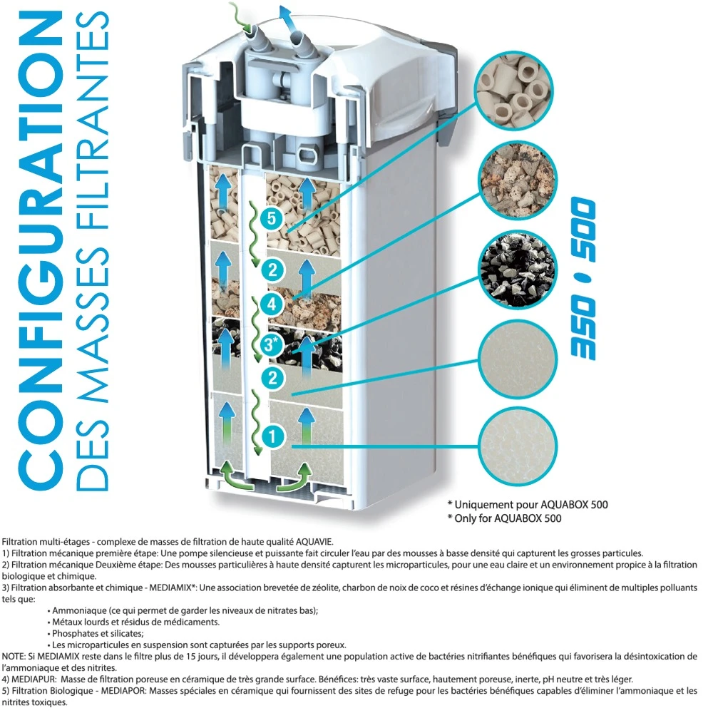 Le filtre externe AQUAVIE AquaBox 500 est livré avec toutes les masses filtrantes nécessaires à une bonne filtration mécanique et biologique en aquarium (voir photos pour le détail des masses filtrantes)