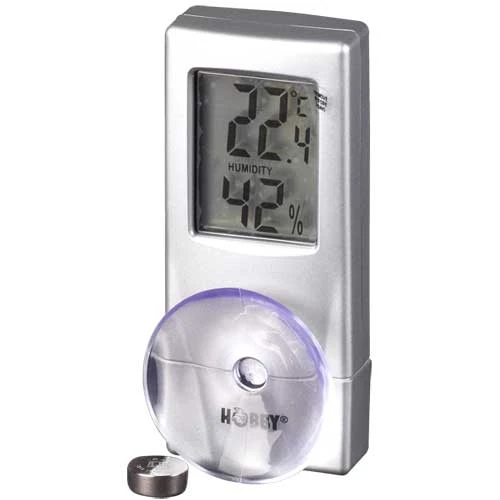 HOBBY Hygromètre/ Thermomètre numérique pour la mesure précise du taux d’humidité et température en terrarium. Mesure de température entre : -20 °C à 60 °C, mesure dhumidité relative : 20 % à 95 %, intervalle de mesure: 10 secondes, précision : +/- 1.0 °C, +/-7 %. Il se fixe par un système adhésif.