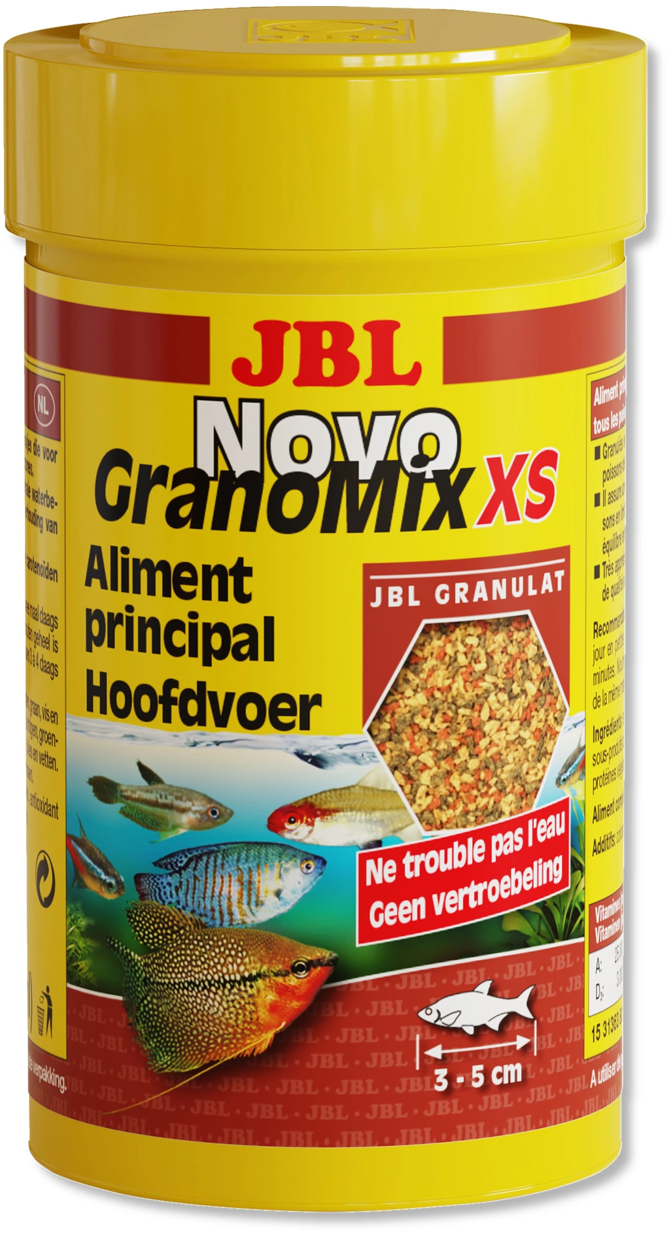 Caractéristiques du produit « JBL NovoGranoMix XS 100 ml nourriture en granulés pour petits poissons d’aquarium de 3 à 5 cm »