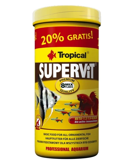 TROPICAL SuperVit 250ml + 20% Gratuit est une nourriture de base en flocons, à multi ingrédients, avec beta-glucan.